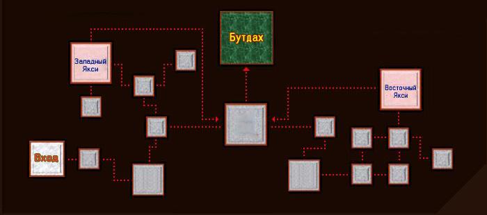 Подземелье Кубарха состоит из множества разбросанных комнат, Якси находятся в верхнем левом углу и в верхнем правом углу (если рассматривать путь по подземелью). Для того, чтобы дойти до Западной Якси, нужно пройти 4 раза прямо, потом налево, затем назад, в тот же портал (относительно расположения персонажа).