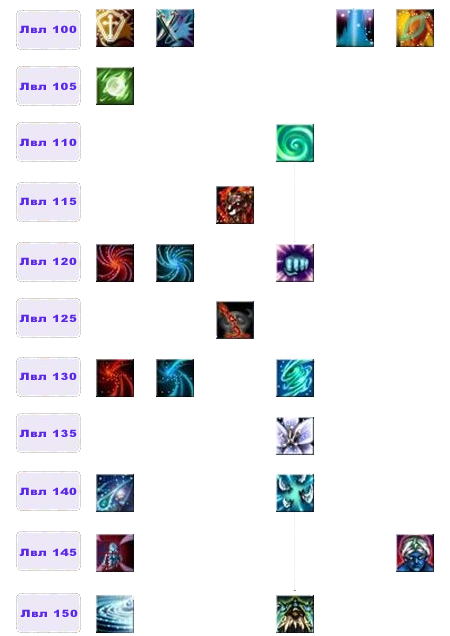 | 130 | Ледяная спираль | Активный | 2 | 15 | Окружает врага ледяным вихрем, снижая скорость атаки и атаку (Физ. Атк. * 150% Дебафф -16% Точность. \ Ск. Атк. (Ур. 11), +10% и -1% Точность. \ Ск. Атк.) | ||